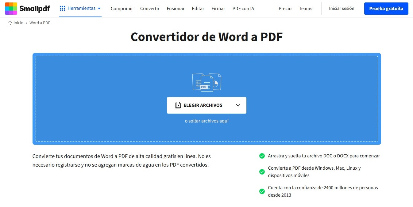 Atención: La mayoría de los convertidores de Word a PDF online no admiten la conversión por lotes ni el uso sin conexión. Si necesitas convertir varios archivos Word a PDF o hacerlo sin conexión a internet, consulta ¿Qué hacer si no funciona el convertir Word a PDF online?